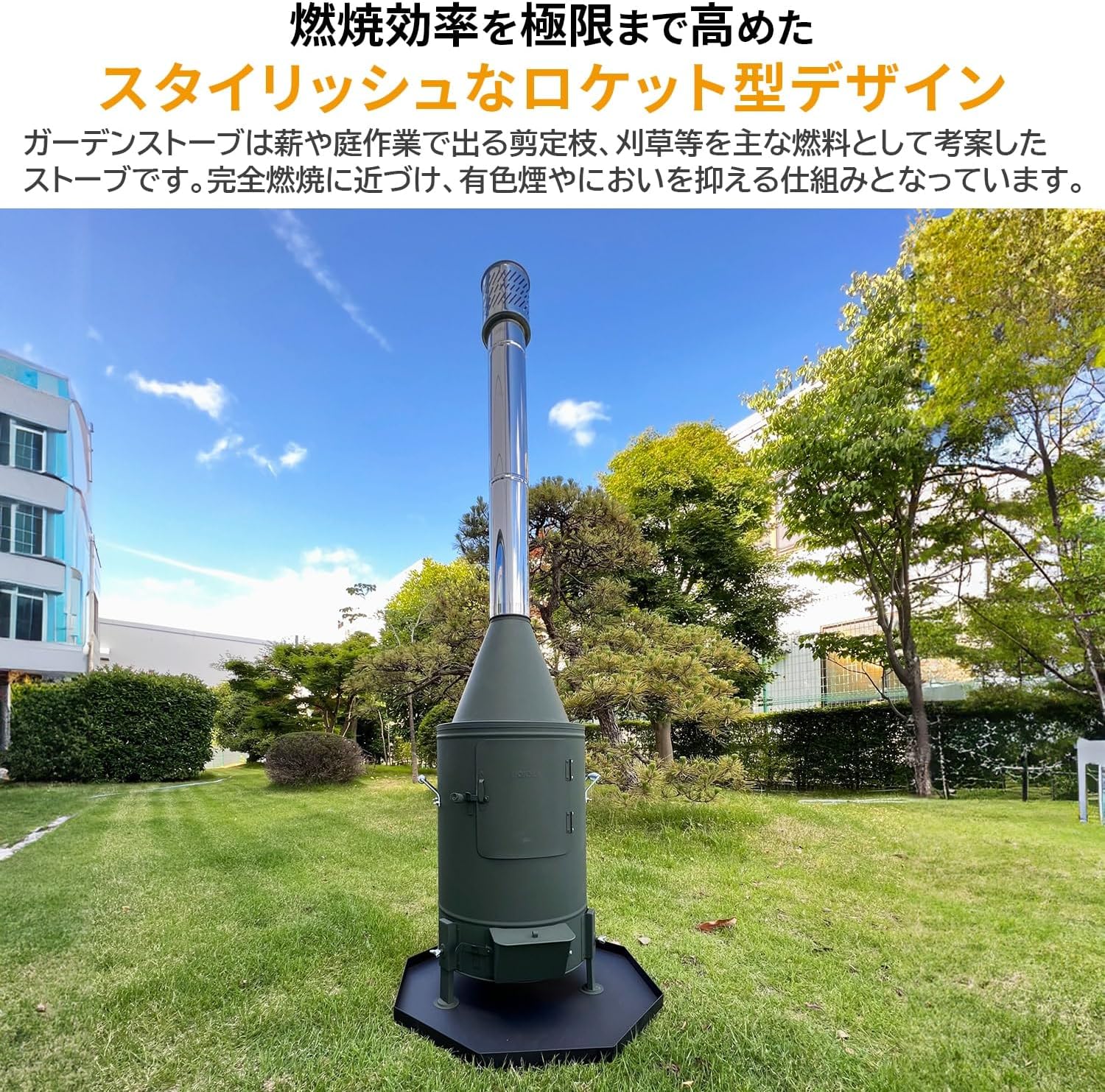 This is an outdoor stove. Stylish locket design for maximum combustion efficiency. In order to reduce smoke and clean the air, it is equipped with a secondary combustion function to prevent imperfect combustion. The combustion auxiliary tube improves combustion efficiency, and exceeds the maximum temperature of 176°F (800°C). Can be used effectively, such as pruning branches and trimming from firewood or garden work. Can also be used for emergencies. Chimney diameter: 4.7 inches (120 mm) in diameter. Combustion Method: Secondary combustion type Accessories: Combusting tube, 3 half-cylinders, round top, dedicated lostle, ashhook, 3 square legs, and handle.
